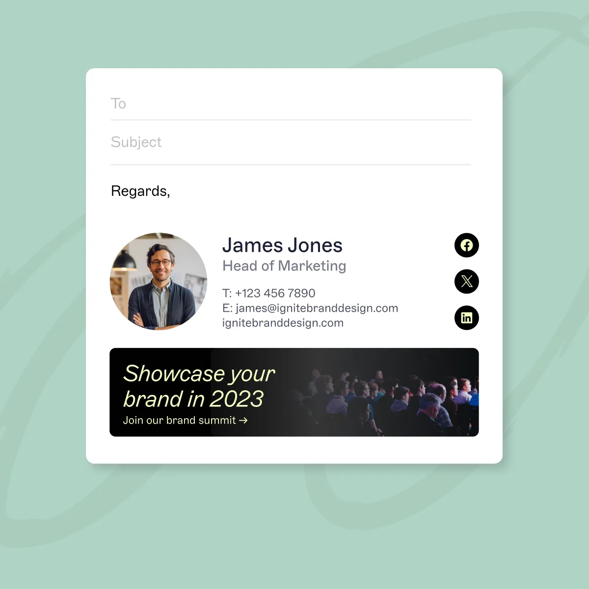 - Choose no more than two font styles and ensure they are web-safe. Limit the color palette to your brand colors to keep the signature cohesive and not visually overwhelming.