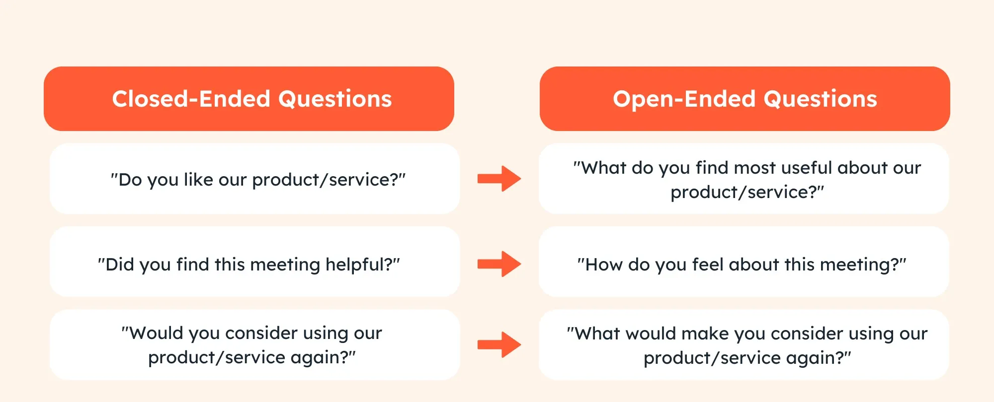 - Mid-conversation: Utilize more specific questions to hone in on details and start aligning your solutions with the prospect's needs.