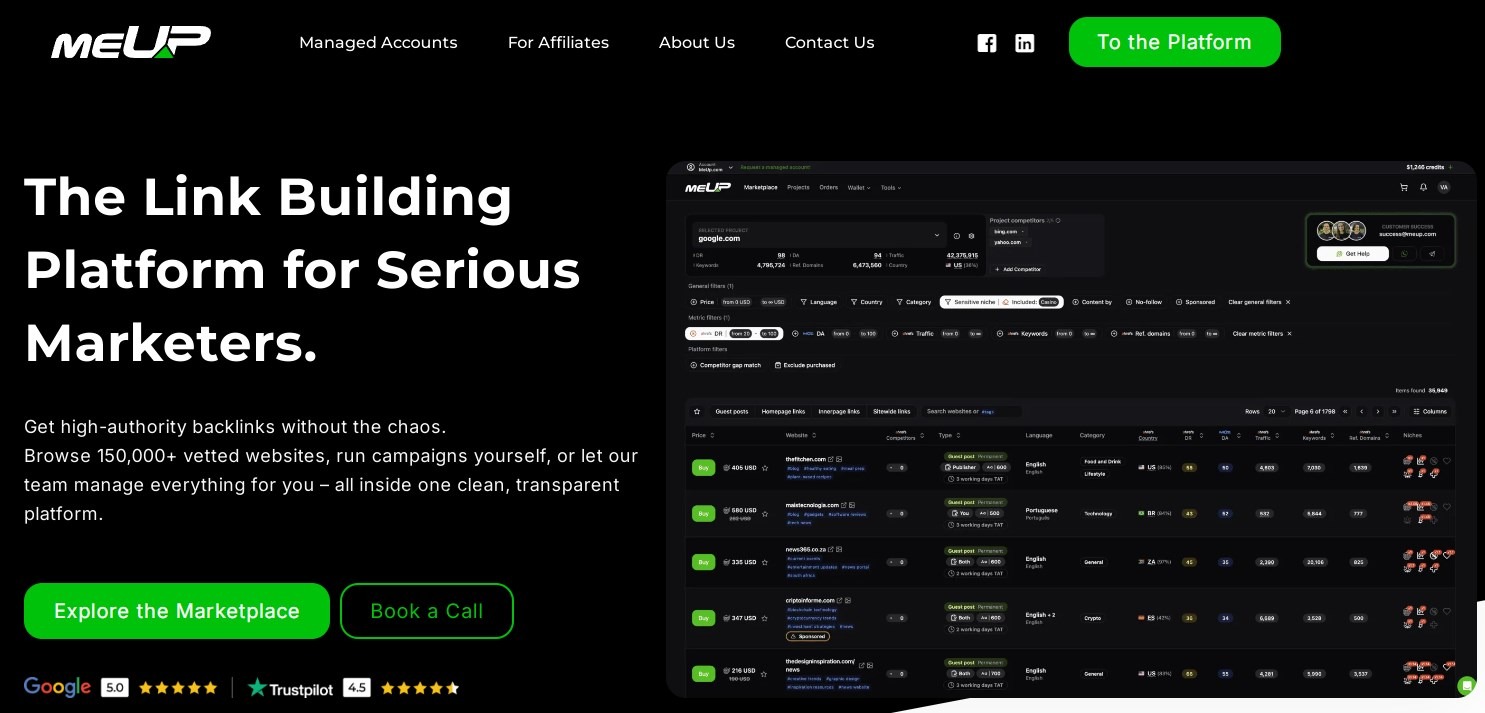 MeUp is a large-scale link-building platform calling itself an "ecosystem." It provides access to over 150,000 vetted websites for guest posts, homepage links, and other placements. The platform integrates several tools into one workflow.