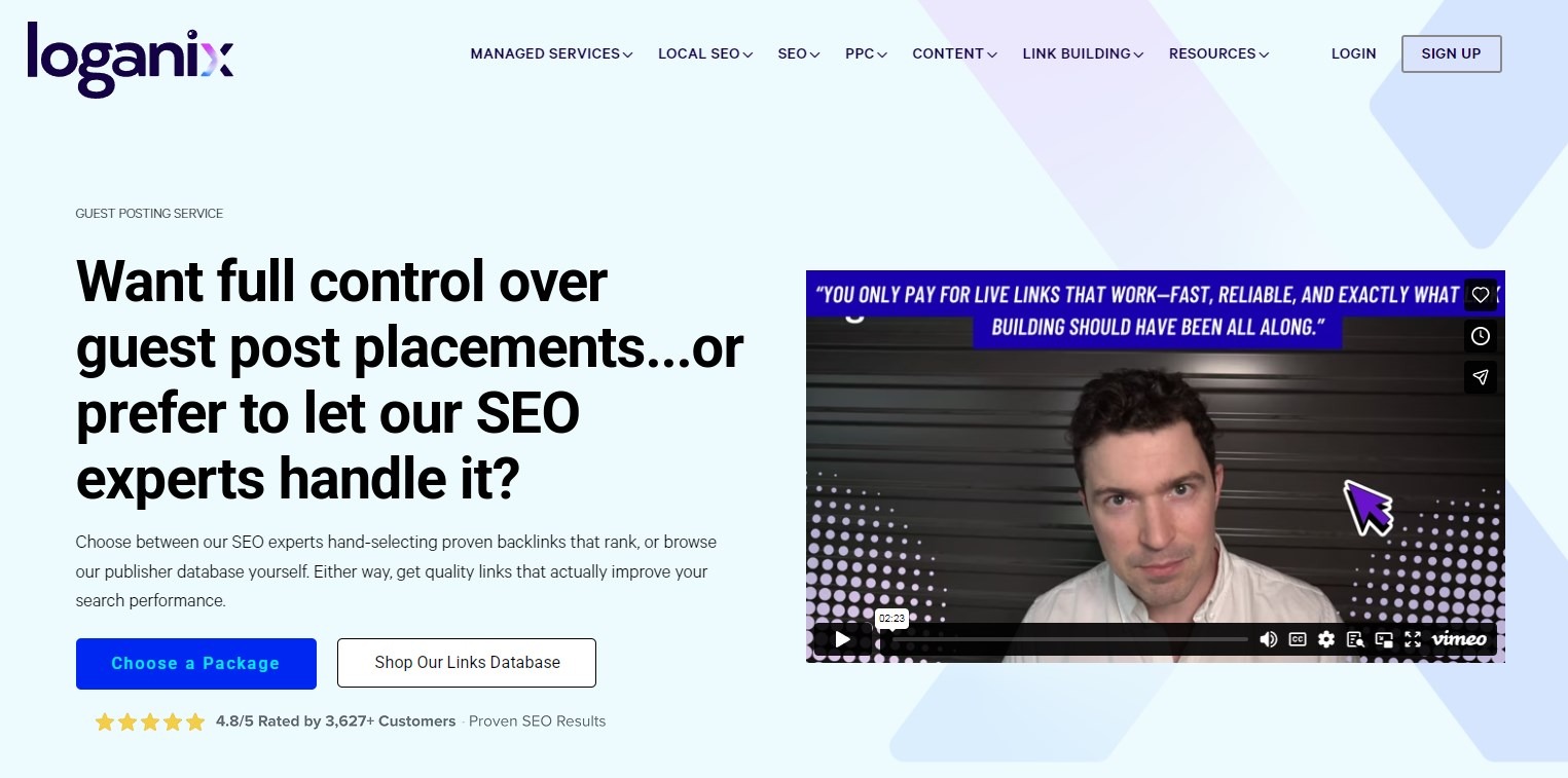 Loganix offers a flexible approach to guest posting. You can choose between two paths. The first is a DIY model where you browse their database of 10,000+ pre-vetted sites. The second is an expert-selected package where their team curates opportunities for you.