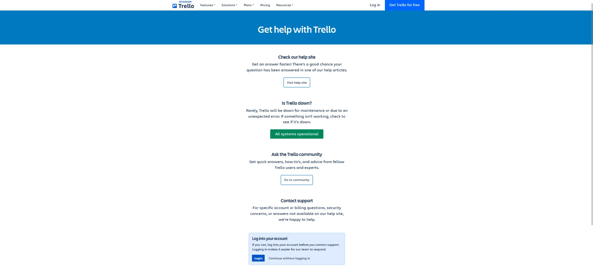 Trello, as part of Atlassian, offers a robust support structure on its Contact Us page that caters to a wide range of user needs. The page features direct options for support through an integrated system where users can submit requests, access community forums, and view extensive FAQ sections.