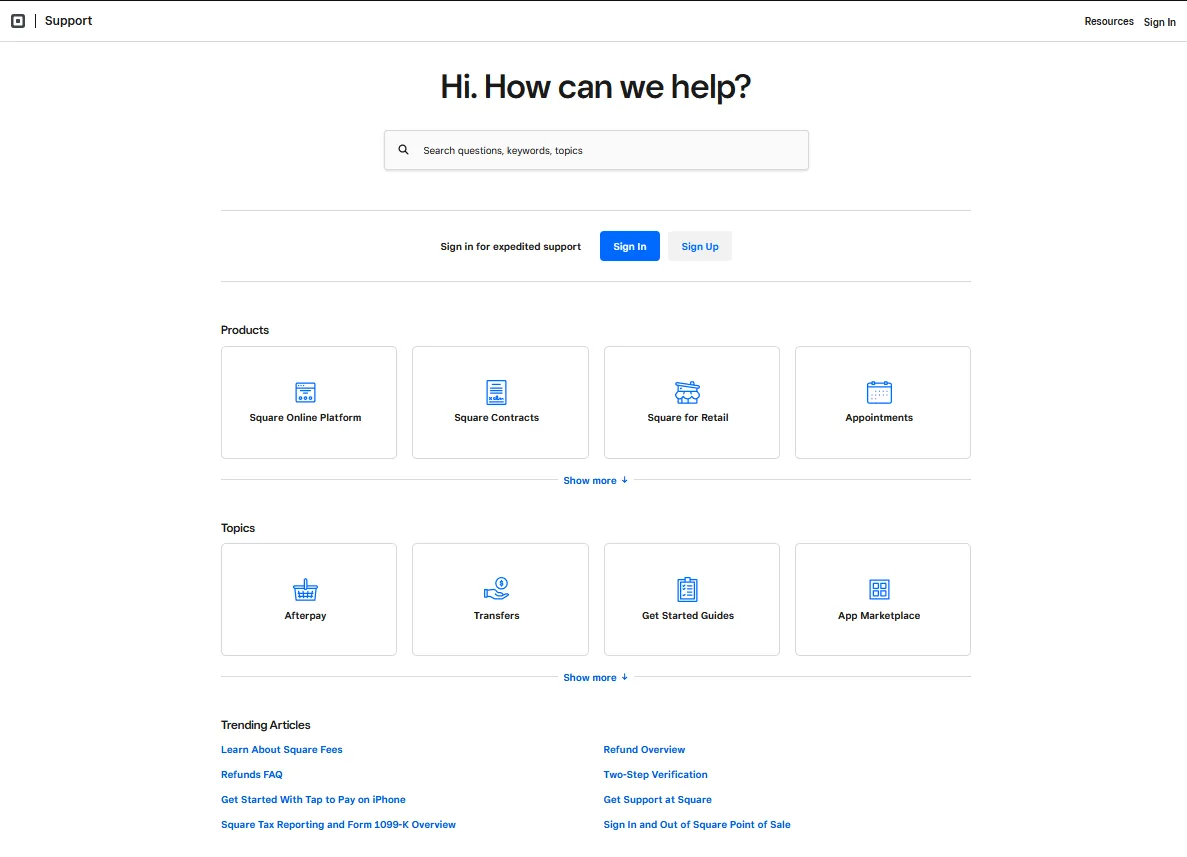 Square's Contact Us page is a comprehensive resource designed to cater to various customer needs, from new users needing setup guidance to existing users seeking specific support. The page prominently offers multiple contact methods, including phone support, email, and live chat, ensuring accessibility for different user preferences.