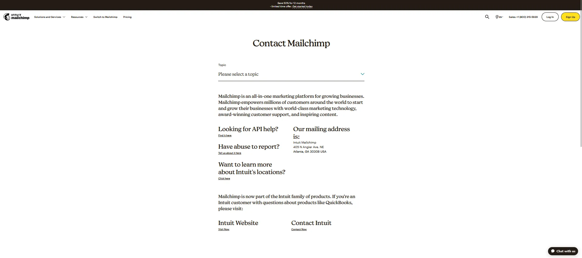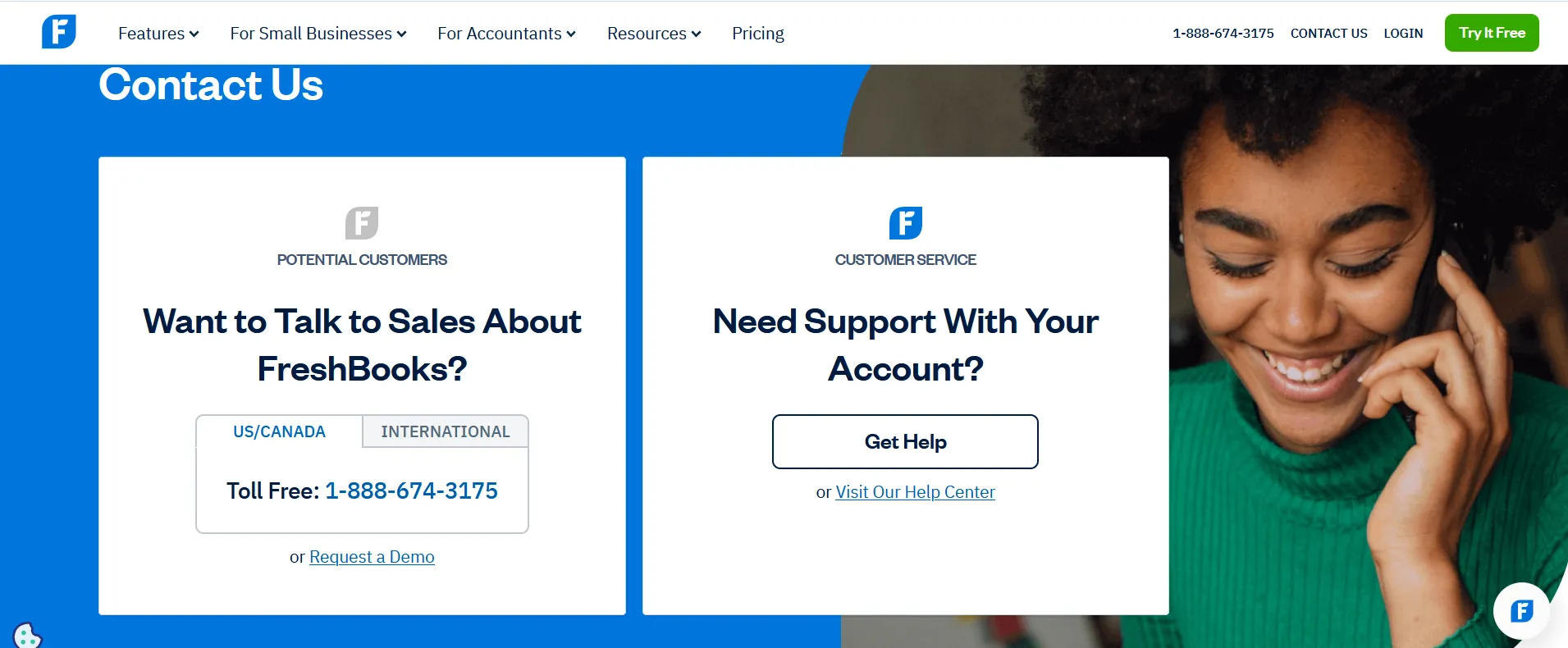 FreshBooks offers a Contact Us page that is geared towards providing targeted support for small business owners and freelancers. The page features a well-organized layout where users can quickly access live chat, phone support, or email assistance.