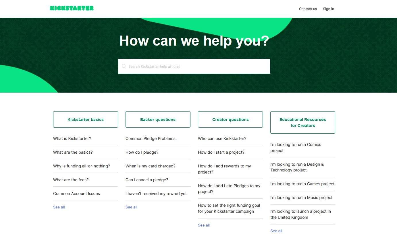 Kickstarter supports its community with a well-structured and user-friendly Contact Us system that emphasizes community support. Users are directed to submit requests through a specific form, ensuring inquiries are properly categorized and handled efficiently.