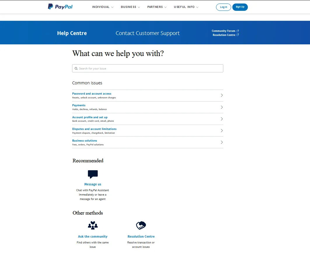 PayPal’s approach to customer support reflects its global presence and the necessity to handle a vast array of customer inquiries. The Contact Us section is integrated into a larger help system where users can search for articles or get directed support based on their specific issues.