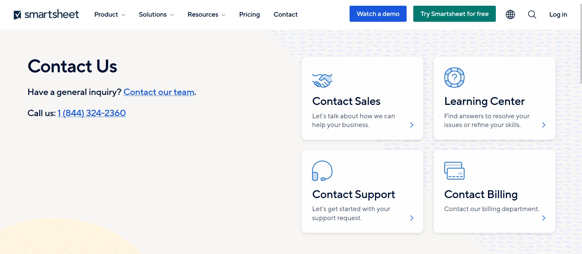 Smartsheet's Contact Us page provides comprehensive support options tailored to the collaborative nature of its platform. Users can access support through multiple channels including live chat, phone, and an extensive knowledge base.