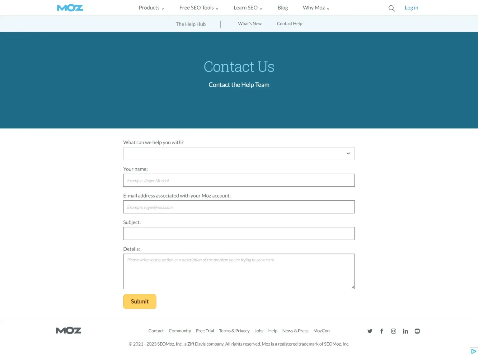 Moz emphasizes direct communication with its Contact Us page, offering a straightforward approach with an online contact form and direct email addresses for different departments. This ensures that inquiries go directly to the appropriate team, facilitating faster and more efficient responses.
