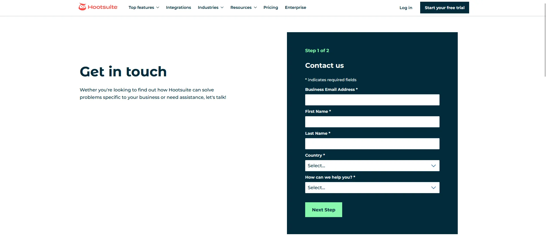 Hootsuite's Contact Us page is designed to cater extensively to its users, providing multiple ways for users to get in touch, including direct call options, live chat, and an online contact form.