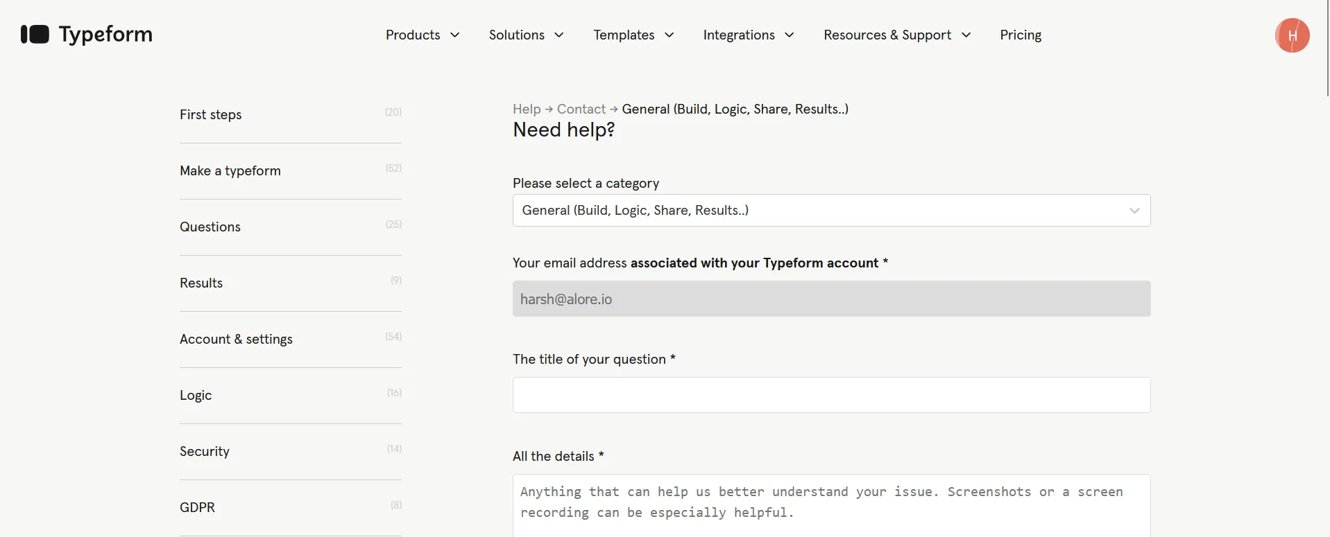 Typeform focuses on providing direct and efficient customer support through their help center. The page features an accessible chatbot that offers instant answers to common queries and the ability to escalate to human support if needed.