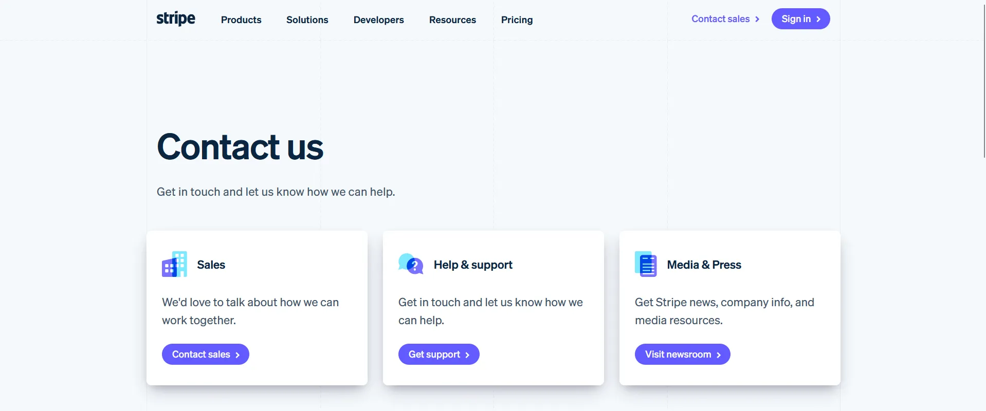 Stripe's Contact Us page is built around its comprehensive support ecosystem tailored for developers and businesses using its payment platform. It provides detailed support through documentation and a dynamic help section that adjusts suggestions based on user input.