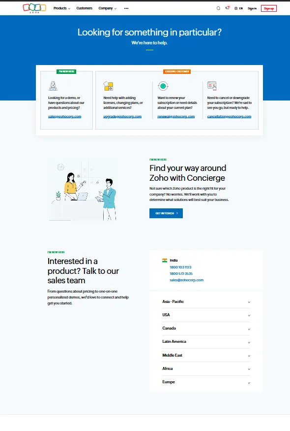 Zoho's Contact Us page serves its global user base with a detailed and localized approach to customer support. It offers region-specific contact information, which is particularly useful for a company with a wide array of business software solutions and an international clientele.