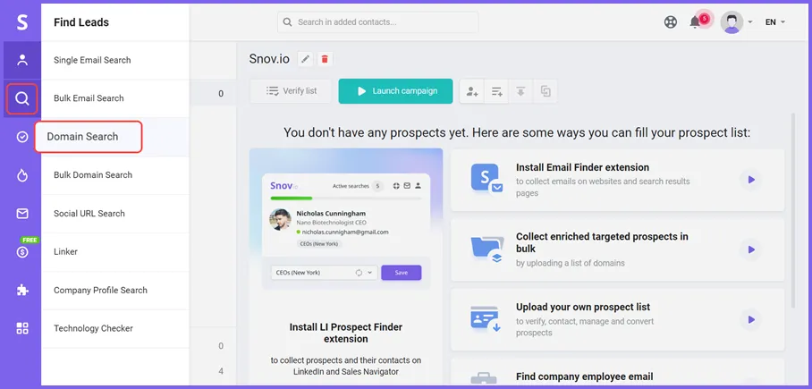 - Email Finder: Finds emails by name, company, or via LinkedIn profiles.