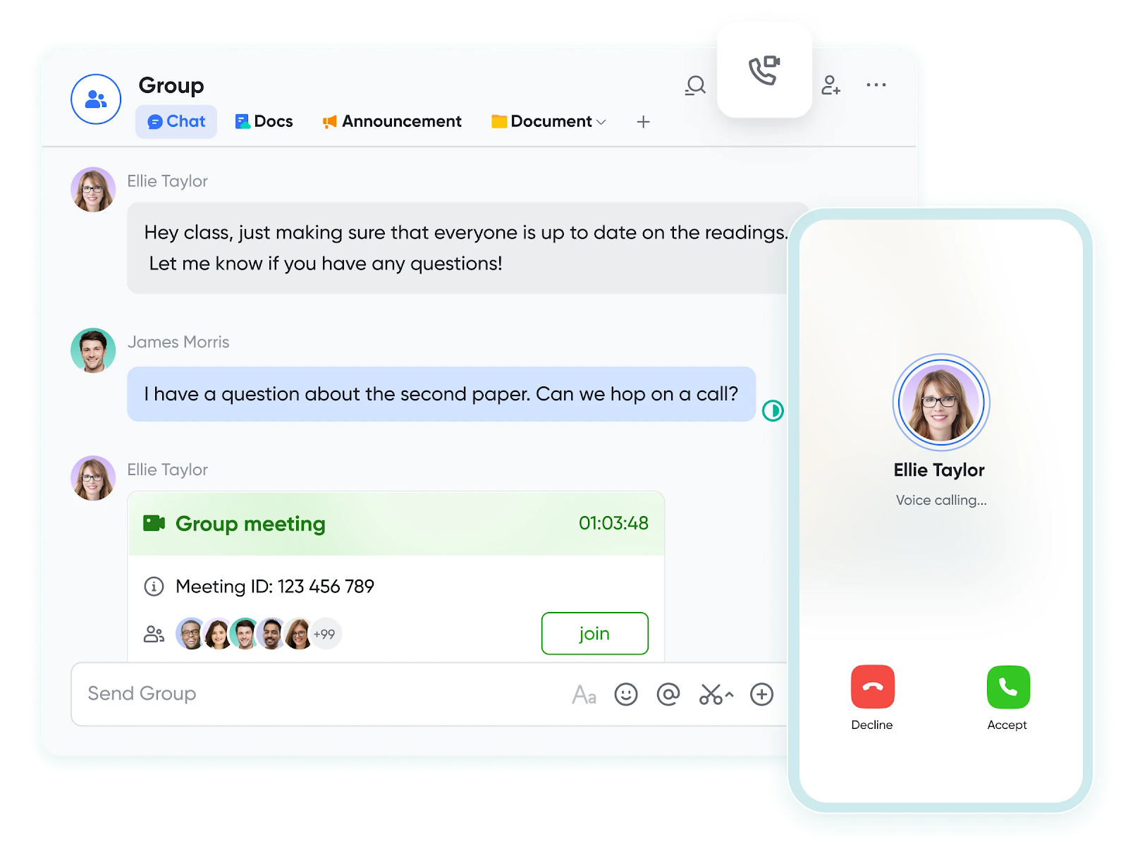 You don't need to have formal meetings to work together. A lot of it happens when people immediately tell each other what's going on, clear things up, or share knowledge to address problems. It's easy to lose vital information when you can't keep track of these conversations. Lark Messenger makes sure that talking every day leads to real results.