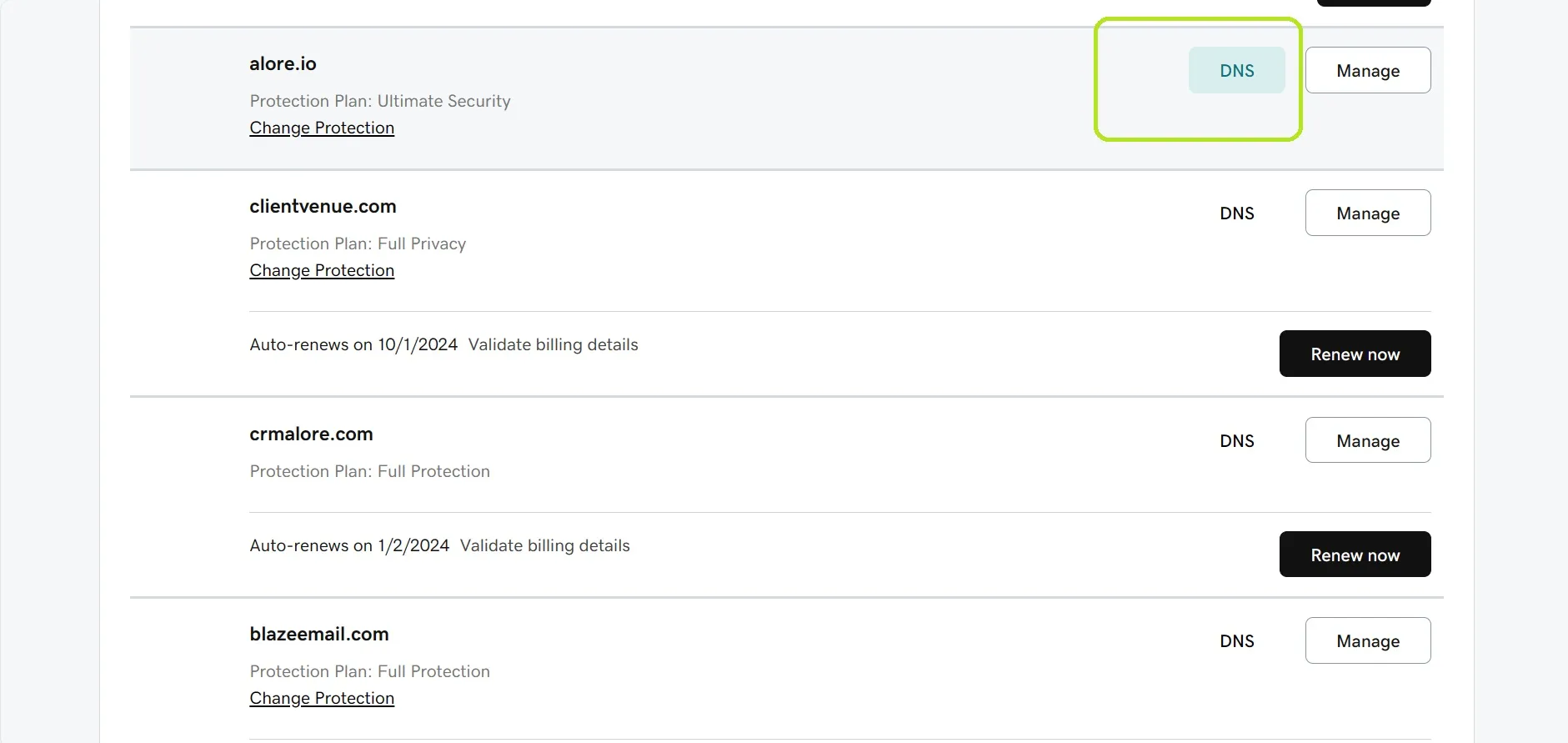 In the 'My Products' section, find 'Domains' and click on the 'DNS' button next to the domain you wish to configure.