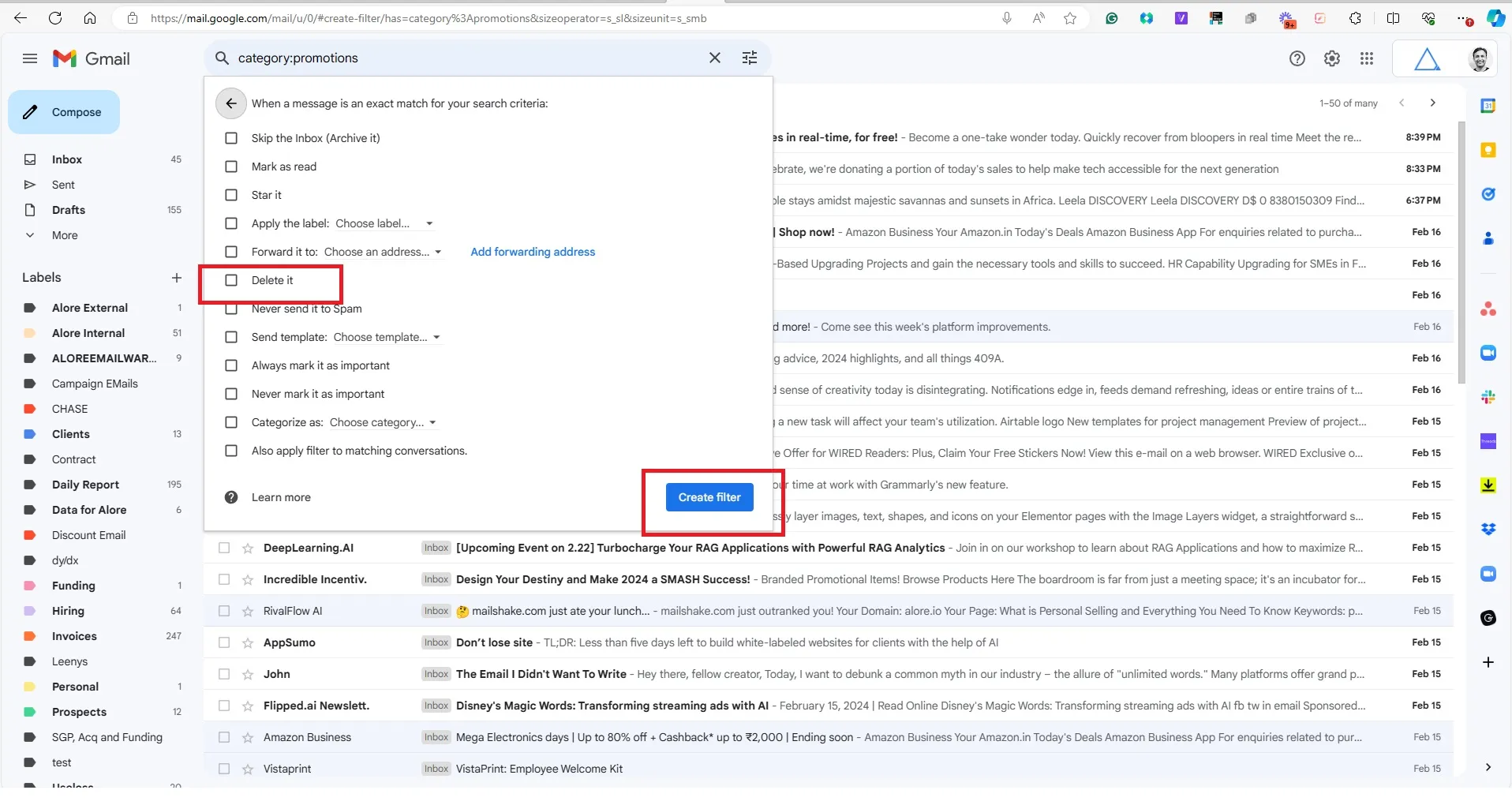 This setup ensures promotional emails are automatically deleted, keeping your inbox tidy and free.