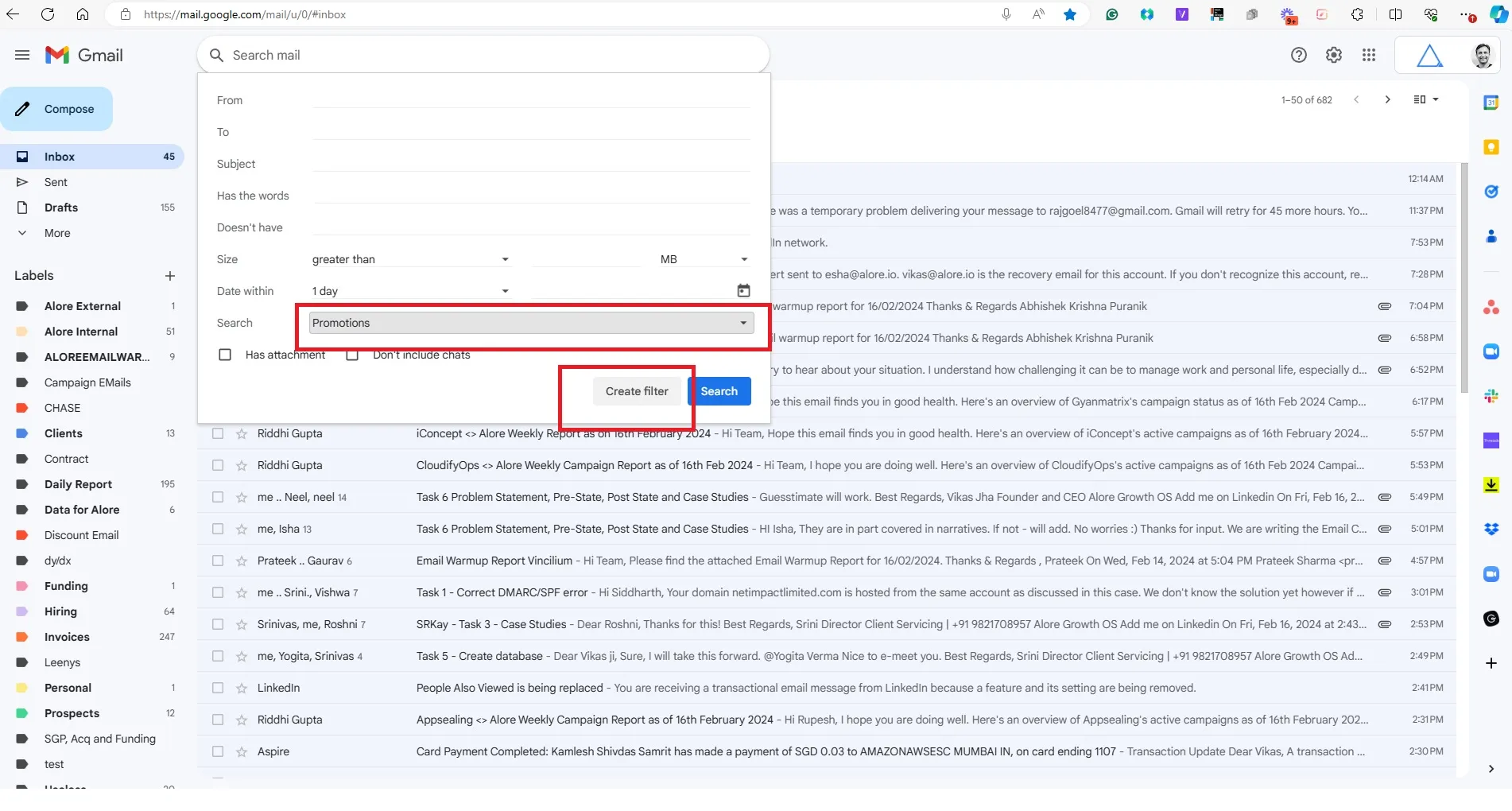 - Define Filter: In the dropdown, scroll and select "Promotions" to target promotional emails.
